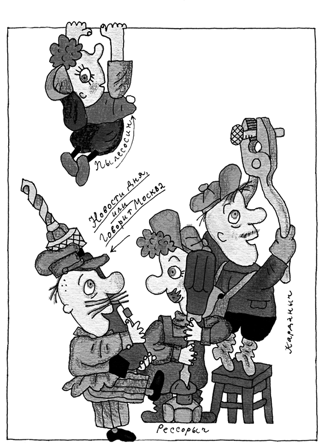 Вот распахнулось окно в часах, и кукушка Машка старательно прокуковала полночь. И тотчас в холодильнике, в часах и в радиоприёмнике раскрылись двери, и на пол стали спускаться гарантийные человечки. В руках они держали фонарики.