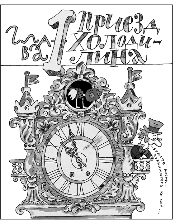 В этих часах сбоку открылась дверца, и вниз скатилась верёвочная лестница. Она доставала как раз до самого пола. Человечек из холодильника обернулся и посмотрел наверх. Он увидел другого маленького человечка – очевидно, хозяина часов.