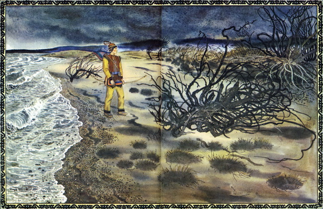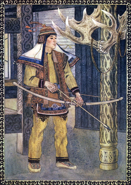 яркими узорами.Одежда оказалась мальчику великоватой. Он снял колчан со стрелами, натянул тугой, упругий лук…