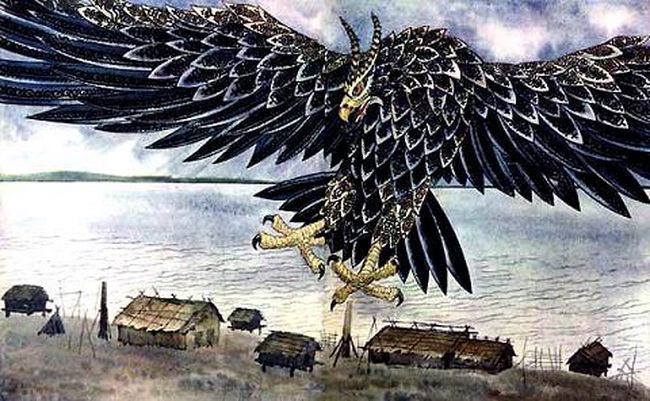 Гапчи поднял голову вверх и увидел в тёмном небе огромную птицу. Она висела над землёй, закрывая солнце широкими, мощными крыльями от востока до самого запада. Тускло мерцал сквозь её железные крылья солнечный свет.