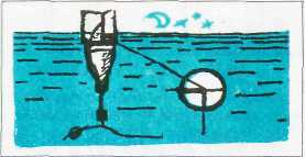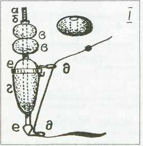 погоде: не сносится в сторону, так как леска всегда находится под водой.Получил определенное распространение так называемый сдвоенный поплавок. Обычный поплавок при ловле со дна всплывает и ложится набок. Тут уж не зевай с подсечкой, потому что рыба, почувствовав тяжесть грузила, сразу же бросает насадку. Продолжительность поклевки можно значительно увеличить, применив сдвоенный поплавок. Основной — нижний поплавок яйцеобразной формы. В нем крепится кусочек тонкой лески длиной примерно 10 см, к которой вверху привязывается верхний сигнальный поплавок веретенообразной формы. Для крепления лески в нижнем поплавке надо шилом сделать углубление и, завязав на конце лески узелок, вставить ее туда, заклинив клинышком. Внизу поплавка вставляется проволочный штырек, на который надевается кусочек изоляции для крепления поплавка к леске.