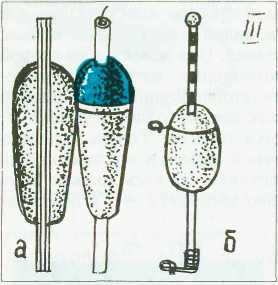 Можно изготовить скользящие поплавки — переменной грузоподъемности и съемный. Перед забросом поплавок сдвигают к грузилу, приманку отправляют в намеченную точку, и она устремляется ко дну. Поплавок же скользит по леске до стопора-ограничителя. Живец или малек погружается на заданную глубину. Из пенопласта вырезают два бруска 13x25x100 мм. В центре каждого из них выдавливают желобок такой величины, чтобы в нем наполовину по диаметру поместилась трубка, например, из птичьего пера, стержня от авторучки, соломки для коктейля и т. п. Оба бруска и трубку склеивают, заготовке придают форму поплавка и покрывают масляной краской.
