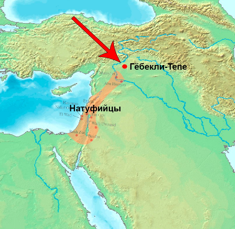 Отметим, что означенные на этой карте натуфийцы – это археологическая культура мезолита, существовала на территории древнего Леванта около 11 500—9500 лет назад (9500-7500 до н.э.) – как раз керамика натуфиской культуры была найдена на раскопках Гёбекли Тепе в наше время. Ну а те древние времена, после натуфийцев эти земли населяли финикийцы, а затем, в ранние библейские времена (конец XXI – начало XX века до н.э.) это были «земли Ханаанские», не раз упоминаемые в Библии.