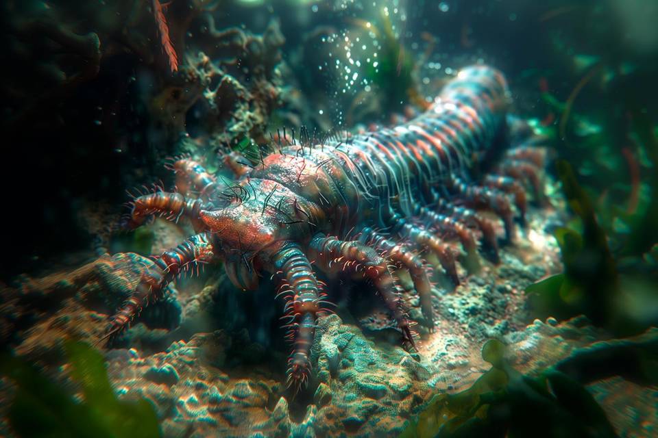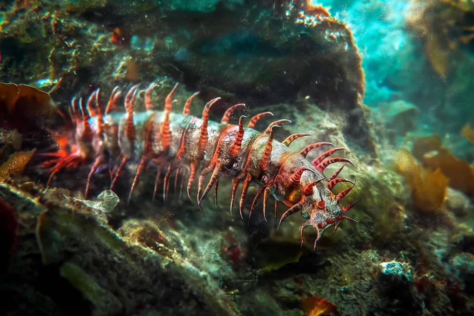 И как только это произошло, тёмный подводный мир заиграл новыми красками, предъявив своих обитателей. Прямо под моим выступом, по дну пещеры потянулась вереница каких-то очень деловых многоножек. Почти метровой длины толстые колбаски с нескончаемым потоком коротких мохнатых лап. На макушке я разглядел два тупых, коротких рога. А когда многоножка, поднялась на задних лапах, став ближе ко мне сантиметров на сорок, то и два верхних резца (практически, как у крыс — нормальных крыс) засветились.