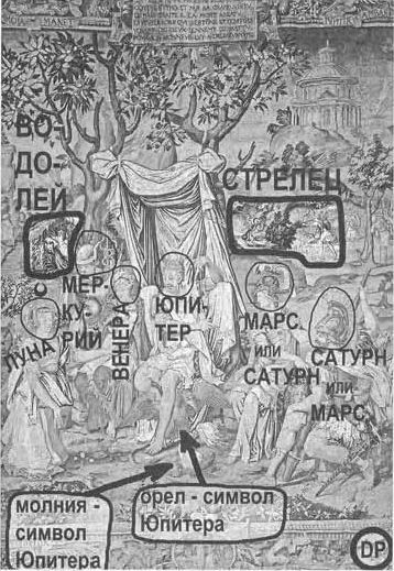 Расшифровка зодиака DP представлена на рис. 4.32. Ещё раз повторим – она совершенно прозрачна и никаких особых сложностей не представляет. Странно, что комментаторы, исследовавшие ковёр, её так и не заметили. Скорее всего – просто не захотели заметить. Отмахнулись по привычке от бьющего в глаза астрономического содержания знаменитой французской шпалеры. А зря. Могли бы узнать много интересного.
