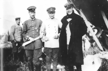 Три ранних аса 1 июля 1916 г. Эрнст фон Альтхаус (в центре), которого держат под локти Вильгельм Франкль и Альфред Ленц. Все летчики из KEK Vaux.
