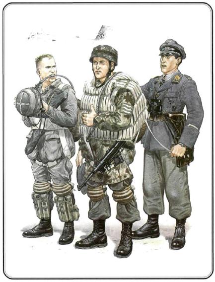 Голова офицера защищена обычным стальным шлемом парашютиста; правда, на фотографиях, сделанных в Норвегии в 1940 г. видно, что некоторые парашютисты в то время носили обычные армейские каски, а некоторые — ранние каски экпериментального образца, похожие на армейские; их легко отличить по горизонтальной щели—прорези над ухом (см. рис. 1 на предыдущей иллюстрации). Прыжковые куртки «первой модели» в 1940 г. были снабжены карманами. На этой цветной таблице представлены различные варианты покроя курток. У некоторых курток имелся только один нагрудный карман слева, у других — один нагрудный и два кармана спереди на бедрах, с горизонтальными застежками. Похоже, что эти ранние куртки всегда застегивались на открытую (не прикрытую клапаном) белую пластиковую молнию: клапан появился в 1941 г. В это время уже начали применять стилизованнуюсистему знаков различия по чинам — такую же, что и на летных куртках и комбинезонах люфтваффе. На рыжевато—коричневом или темно—синем прямоугольном клапане над локтем справа и слева нашивались или наносились