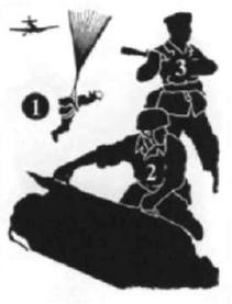 У унтер—офицера (рис. 3) нарукавных знаков различия нет — похоже, что в 1940 г. их носили редко. Здесь изображен солдат штурмовой группы майора Витцига во время захвата Эбен—Эмаэля (основой для рисунка послужили две фотографии, хорошо дополняющие друг друга). Похоже, что во время этой операции все егеря тщательно замазали грязью каски с целью маскировки. В этой штурмовой группе пистолетом—пулеметом был вооружен примерно каждый четвертый десантник; похоже, что у каждого был только один подсумок на три магазина, и все, как обычно, имели пистолеты. Куртка унтер—офицера имеет набедренные карманы, набитые гранатами. Обратите внимание на вермахтовский фонарик на груди — характерный элемент снаряжения младшего командира. Возможные варианты размещения пистолета—пулемета МР40 во время прыжка показаны на следующей иллюстрации (рис. 1 и 2), но в данном случае это не имело значения, поскольку высадка на крышу форта Эбен—Эмаэль проводилась с помощью планеров.