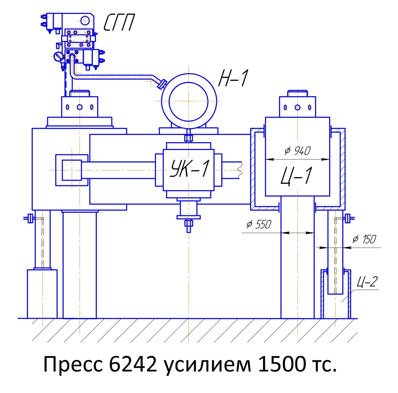 При давлении 170 кгс / кв.см пресс обеспечивает усилие 1500 тонн.