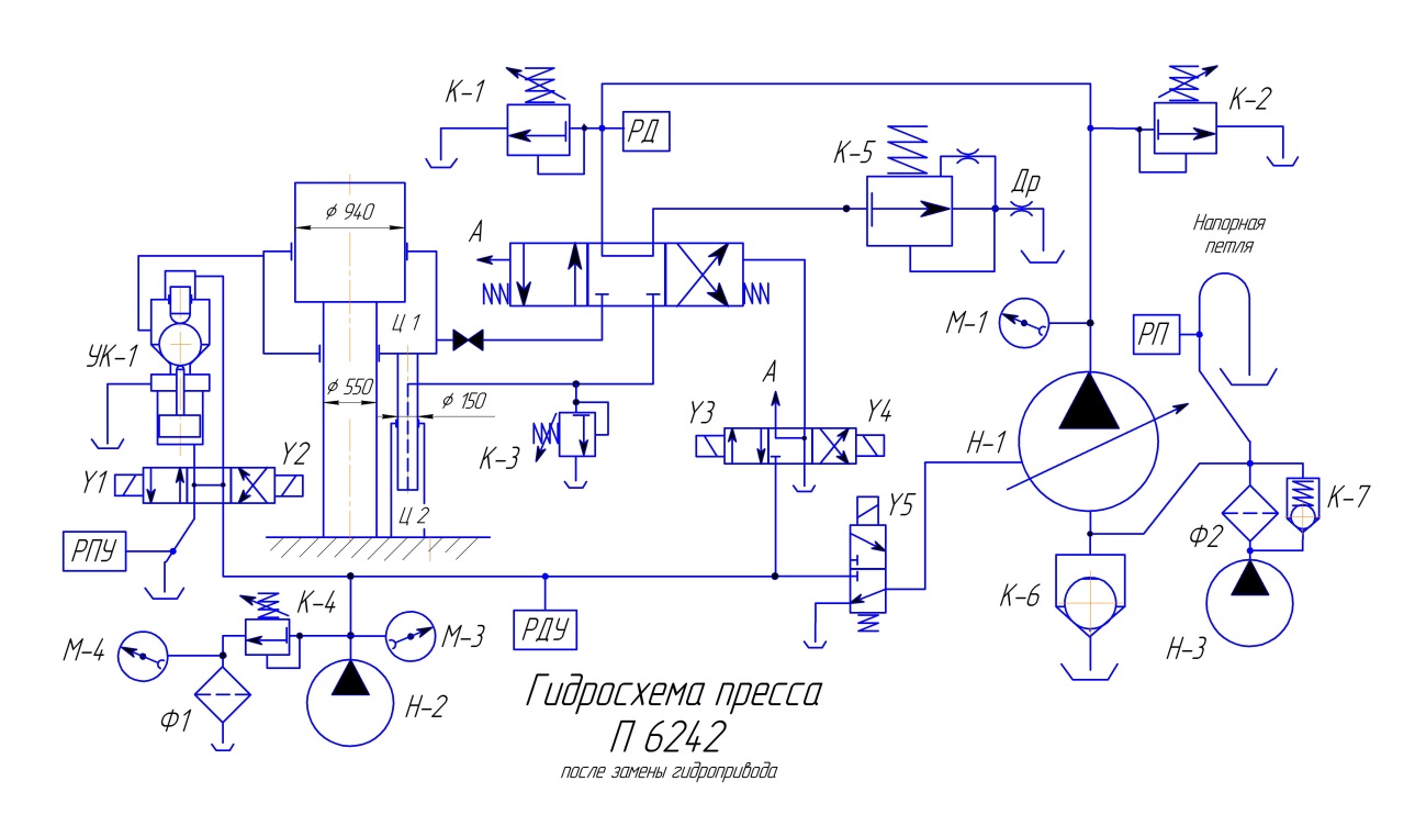 По этой гидросхеме выполнялась модернизация гидропривода пресса.