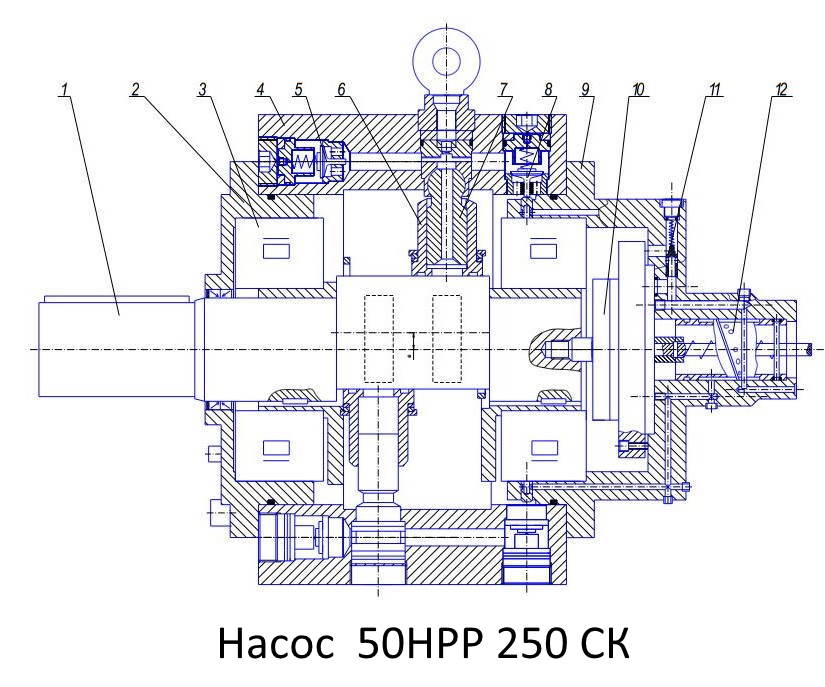 Силовой поток масла обеспечивает плунжерный насос марки 50 НРР 250 СК производства Харьковского завода " Гидропривод " версия 1987 г. Насос Н-1 с дистанционно регулируемой подачей.