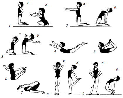 9. И.п. –сидя на полу, прямые ноги немного разведены, опора на ладони прямых рук. Поднять правую ногу на 30–40 см и завести ее максимально налево (стараться достать пол), колени не сгибать. То же другой ногой. Темп средний. Дыхание свободное. Повторить 6-10 раз каждой ногой.