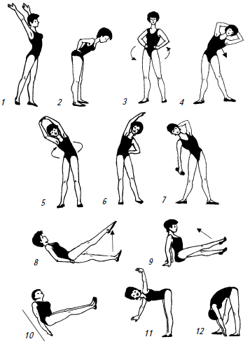 руки разведены в стороны, туловище наклонено вперед так, чтобы корпус был параллельно полу, голова поднята. Оставляя ноги неподвижными, выполните поворот корпуса и головы вправо, затем влево. Темп средний. Дыхание свободное. Повторите 10–12 раз в каждую сторону.12. И.п. –стоя, ноги на ширине плеч, руки опущены. На выдохе сделать глубокий наклон вперед, стараясь достать носок левой ноги, на вдохе вернуться в и.п.То же выполнить, наклоняясь к правой ноге. Темп средний. Повторить 3–5 раз в каждую сторону.