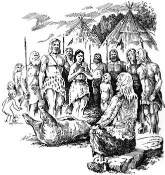 Круглые островерхие хижины стояли полукольцом, входом к родовому кострищу. Возле кострища в ряд уложены камни и обгорелые чурки, на них обычно сидели старейшины рода и отличившиеся на охоте. Гирр остановился неподалёку от кострища и стал ждать. Сюда скоро сбежалось всё племя. Мужчины, женщины, дети с нескрываемым любопытством разглядывали пришельцев. Их оружие переходило из рук в руки. Мужчины качали головами и цокали языками: такого оружия им видеть не приходилось. Наконец из средней хижины, которая отличалась большими размерами, появилась старейшая мать рода в сопровождении двух женщин, а за ними – седой могучий мужчина, вождь племени на охоте и в бою. В поселении правила Агу – мать матерей. Особым уважением и властью пользовалась старейшая мать. Она назначала и смещала вождя,