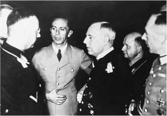 Канарис (третий справа) никогда не входил в ближайшее окружение Гитлера, а потому всегда держался настороженно в присутствии своего соперника Гиммлера (в черном мундире и очках слева). На фото, сделанном до войны, запечатлен также Йозеф Геббельс (в светлом кителе в центре)