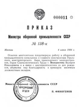 Отмечу важность назначения на пост главного конструктора предприятий ВПК высокограмотных выпускников военных ВУЗов. В отличие от специалистов — выпускников гражданских вузов первые хорошо знают и представляют себе условия на поле боя, в которых должен участвовать создаваемый ими образец военной техники, и потому могут существенно и обосновано влиять на формирование разрабатываемых заказчиком тактико-технических требований и правильно относиться к замечаниям и критике создаваемых конструкций изделий. Полезно для дела «носить погоны» нескольким заместителям главного конструктора и начальникам ведущих отделов КБ. Валерий Николаевич следовал этому правилу.