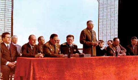 В первом ряду (сидят) слева направо: П.П. Исаков, В.Н. Венедиктов, командующий 5ТА генерал-лейтенант Салтыков, докладывает первый заместитель командующего КВО генерал-лейтенант Г.Д. Городецкий; первый справа — Н.С. Попов