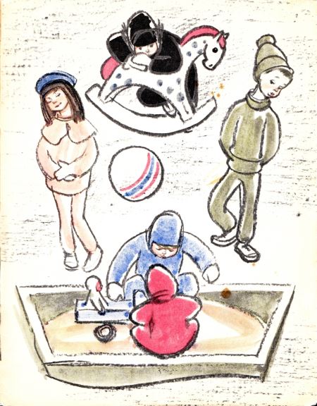 Во дворе уже гуляли: девочка в синем берете, девочка с куклой, мальчик-самолёт. Этот мальчик играл в самолёт. Он бегал по двору. Руки у него были крыльями. И он всё время гудел: „Ры-ры-ры…“ Как мотор.