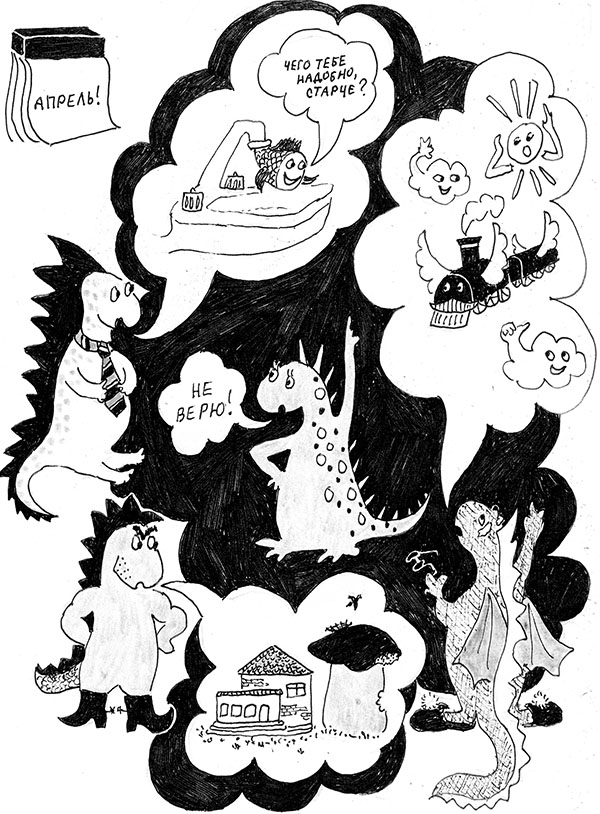 Однажды в апреле шёл дракон Кузя по раскис-шей дороге и думал: «Сегодня первое апреля. Сегодня меня все будут разыгрывать. Главное – никому не верить».
