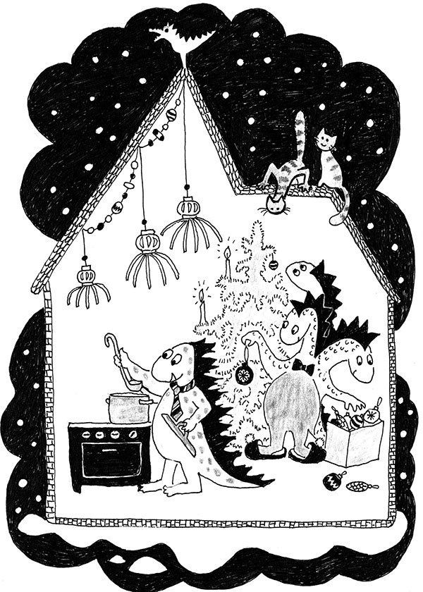 Не надо думать, что Потапов так уж любил борщ. В новогоднюю ночь драконы обычно едят салат оливье, жареную курицу и торт. Потапов всё это приготовил, потому что ждал гостей. Ему помогал на кухне дракон Аспирин. Это был очень порядочный дракон, со всех сторон положительный. Закончив резать салат, Аспирин сказал: