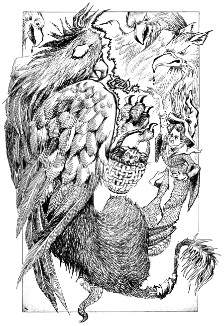 И он сунул огромную, покрытую перьями лапищу в повозку и вытащил оттуда ближайшую корзинку с кошкой.