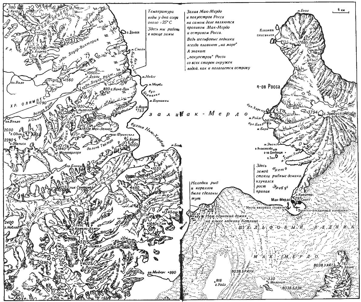 Проехали маленький перевальчик между холмами, и открылась новая перспектива. Дорога идёт вдоль залива, метрах в пятистах от берега. До самого берега нет снега. Там и сям кучи чёрной земли. Чуть посветлее наезженные ленты дорог. Беспорядочно разбросаны красные, синие, белые дома, полукруглые зелёные бараки, похожие на бочки, положенные боком и наполовину врытые в землю. Высокие, из гофрированного железа, с двухскатными крышами здания — то ли склады, то ли мастерские. Между зданиями виднеются бухты кабеля, листы металла, какие-то заржавевшие машины. В стороне виднеется островерхая возвышенность; это Обсервейшен-холм. Ближе к берегу — две небольшие ровные площадки. На чёрном фоне земли чётко выделяются ярко-красные вертолёты. А дальше, создавая резкий контраст, блестит снег на льду замёрзшего моря.