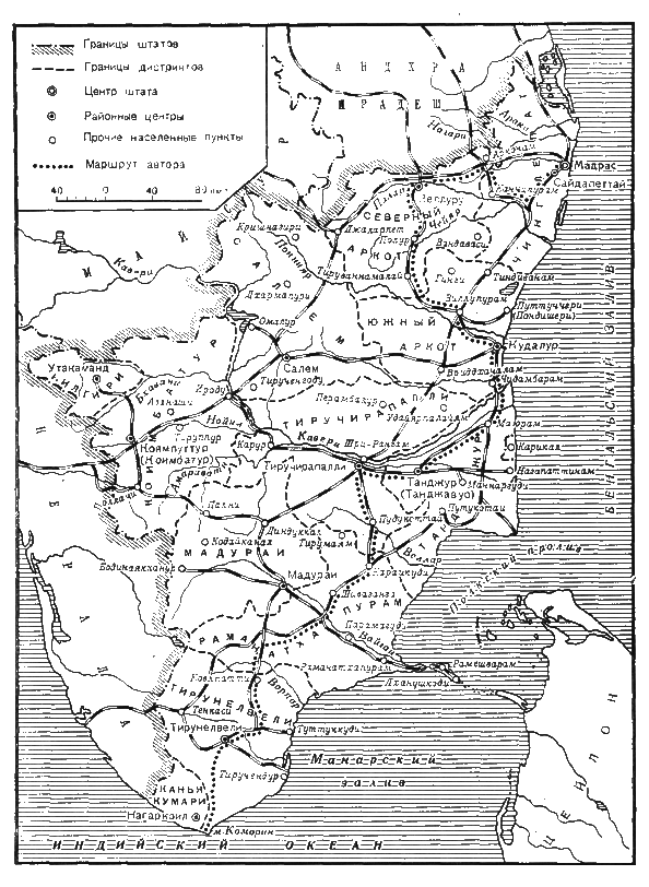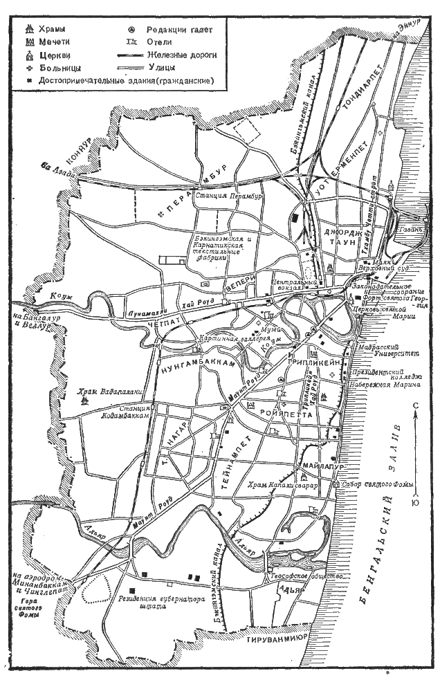 Нередко город начинается со свежей газеты, которую покупаешь на городском вокзале или на предыдущей станции. Со страниц, еще пахнущих типографской краской, встает город во всем разнообразии повседневных забот, со своими противоречиями и контрастами, с мелкими и большими сенсациями, с напряженной политической борьбой, с приемами и балами в фешенебельных отелях, с яростными криками демонстрантов, требующих лишнюю рупию к зарплате, с деловым шумом биржи и ночным грохотом его гавани, с огнями и барабанным боем храмовых праздников. Газетные заголовки и скупые строчки информации доносят пульс и биение города: «Две новые фабрики вступили в строй в промышленном предместье города — Гинди»; «На следующей неделе в город прибывает великий святой Шанкарачария — 68-й духовный глава шиваитов»; «Советский корабль «Академик Архангельский» ищет нефть у нашего побережья»; «Известный астролог предсказывает поражение партии Национальный конгресс на следующих выборах»; «Широкий план реконструкции гавани скоро будет приведен в действие»; «Два преподавателя средней школы покончили с собой, так как они принадлежали к разным кастам, полюбили друг друга и чувствовали, что их любовь не имеет будущего»; «Забастовка шоферов такси и водителей авторикш продолжается»; «Клеопатра. Вечно прекрасная. Фильм о королеве, которая покорила двух великих римлян — Юлия Цезаря и Марка Антония»; «280 случаев холеры наблюдается в городе. Восемь человек умерли от черной оспы»; «Подробности личной жизни потомков могущественного наваба Карнатика. Воспоминания о пирах в Чепакском дворце»; «Толпы желающих купить рис осаждают лавки. Длинные очереди за рисом становятся обычной картиной в городе»; «В храме Капалишварам сегодня вечером состоится пуджа и церемония в честь бога Шивы»; «Четыре констебля ограбили клерка, отняв у него тридцать рупий»; «Город прошел еще через один страшный день, когда температура воздуха достигла +42°, а влажность — 90 процентов». Вот далеко не полный перечень событий жизни одного дня двухмиллионного населения крупнейшего города юга Индии, столицы штата Тамилнад, — Мадраса. В таком разнообразии дел предстал он передо мной, когда я сошла с поезда Дели — Мадрас в июне 1963 года.