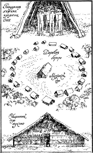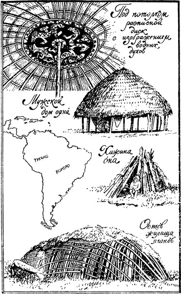 Индейцы на Ваупес не имеют особых мужских святилищ. Вся община (человек 20–30, в XIX в., видимо, больше) живет в огромном доме, или малоке. Подобно малоке уитото, о празднике освящения которой уже рассказывалось, общинное жилище тукано и араваков — своеобразная модель мира, каким его представляют индейцы. Каждый участок на полу, каждый столб или перекладина имеют свою символику, соответствуют частям мироздания. Пожалуй, на Ваупес эта символика еще сложнее, так как она развертывается не только по вертикали (пол — земля, крыша — небо), но и по горизонтали. Фасад малоки соответствует подземному миру, а по мере приближения к ее задней стене идущий как бы поднимается вверх. Большое продольное бревно, тянущееся через все здание, символически считается соответствующим вертикальному (!) мировому столпу. Возможно, что эта парадоксальная система представлений возникла в результате каких-то изменений в архитектуре общинного жилища, после которых некоторые балки, ставившиеся вначале стоймя, изменили свое положение. Конструкция малоки тукано с прямой передней и округлой задней стеной уникальна и свидетельствует о сложной истории его становления.