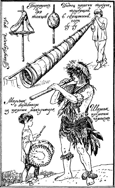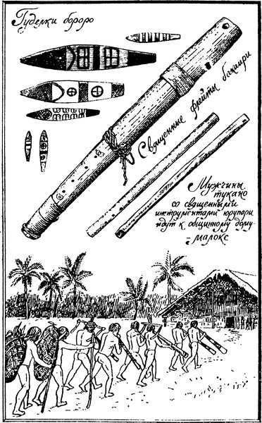 инструменты. Во-вторых, церемонии связаны с земледельческими работами, имеют четкий календарный характер. Наконец, в-третьих, шингуано не только организуют периодические массовые праздники, но и совершают в мужских домах ежедневные обряды с участием лишь нескольких человек. В них можно видеть зародыш той «службы» богам, которая постоянно совершается в храмах развитых религий.Шингуано каждый день выделяют людей, которые должны играть в мужском доме на флейтах или, скорее, фаготах, сделанных из бамбука или дерева. У мехинаку, например, самый большой из инструментов, длиной около метра, воплощает демона Кауку, а два поменьше (70 см) — его жен. К этой троице примыкает четвертый дух, который своего инструмента не имеет. Голос его передает мужчина, то и дело кричащий фальцетом: «ю-ку-ку, ю-ку-ку!» После игры «жрецы» съедают от имени демона похлебку из растертых клубней маниока. Неисполнение всех этих правил приведет, по мнению индейцев, к тому, что Каука заберет к себе души жителей селения.