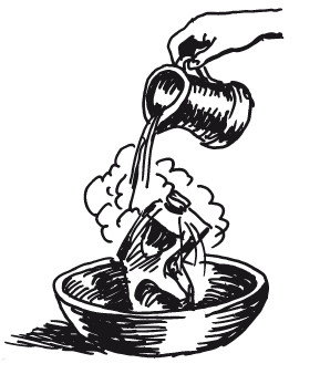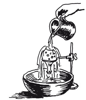 Выждав этот момент, облейте флакон кипятком, – вода не закипит. Но положите на его донышко немного снегу или даже просто облейте его холодной водой, как показано на рисунке, – и вы увидите, что вода закипит… Снег сделал то, чего не мог сделать кипяток!