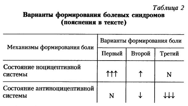 Существуют три варианта формирования боли (табл. 2). Первый — за счет напряженности ноцицептивной системы при нормальном состоянии антиноцицептивных механизмов. При втором варианте — несмотря на лишь умеренное напряжение ноцицептивной системы боль значительна за счет умеренного снижения активности антиноцицептивных механизмов и увеличения болевой чувствительности. И, наконец, при третьем варианте боль формируется исключительно вследствие резкого снижения активности антиноцицептивных систем и резкого повышения болевой чувствительности.