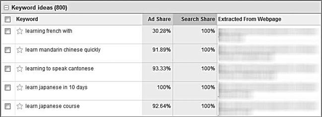 Следующий столбец – «Содержание веб-страницы» (Extracted From Webpage; на рис. 3.14 данные скрыты из соображений конфиденциальности). Это та страница, которую Google считает самой релевантной на вашем сайте для данного ключевого слова. Если вы заводите отдельные страницы запросов, которые используете исключительно для оплаченного поиска, данные этого столбца не представляют для вас ценности. Если же вам нужно быстро создать крупный аккаунт, целесообразно дать Google команду изучить ваш сайт на предмет подбора ключевых слов и самых подходящих для них целевых страниц. Это поможет вам взять быстрый старт при создании и расширении AdWords-аккаунта.