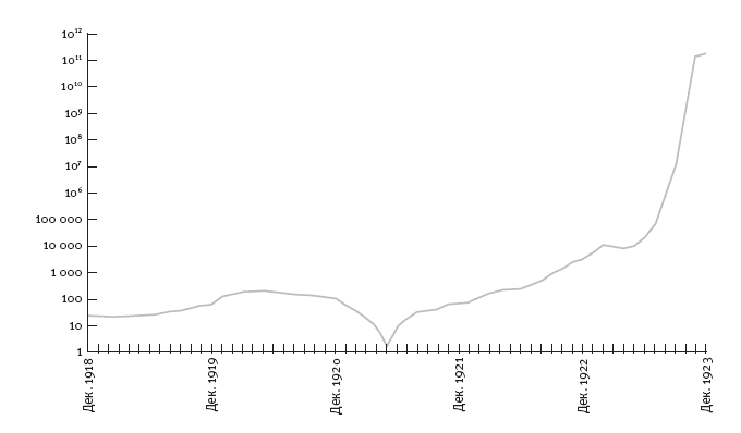 Рисунок 18. Годовая инфляция в Германии (прожиточный минимум; логарифмическая шкала) в 1918–1923 гг.