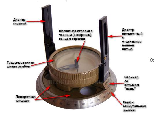 Гониометр ГР —прибор, состоящий из двух имеющих общую вертикальную ось металлических цилиндров различного диаметра с узкими щелями-диоптрами для визирования и коническим переходом. На конической поверхности нижнего цилиндра нанесена шкала лимба, верхнего – два диаметрально противоположных друг другу верньера. Нижний цилиндр имеет отверстие для крепления на штатив или вешку. На торце подвижного верхнего цилиндра укреплена круглая буссоль ( компас повышенной точности ).