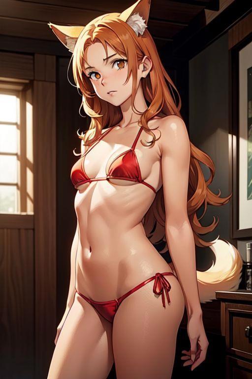 Открыв дверь шире, я замер на месте. Передо мной стояла девушка с длинными рыжими волосами почти до поясницы, и… да-да, у неё были лисьи уши и пушистый хвостик! Её стройная фигура была облачена в яркое бикини, которое подчёркивало каждую линию её тела. Глаза лисички сияли озорной искоркой, а на её губах играла лёгкая улыбка, способная растопить любое сердце.