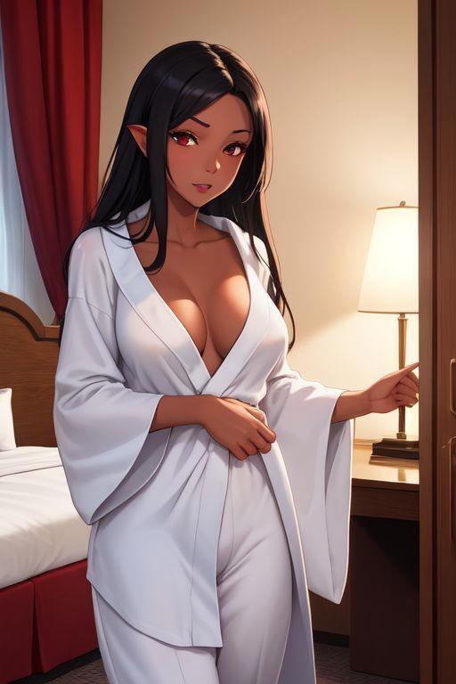 Я открыл дверь, едва сдерживая зевок, и увидел перед собой демонессу Верначи. Её кожа цвета красного вина переливалась в свете ночника, а длинные чёрные волосы струились по плечам, словно шёлк. Глаза её были тёмными, почти бездонными, и в их глубине мерцали искры страсти. Халат, небрежно завязанный на талии, едва прикрывал её стройную фигуру, позволяя мне мельком увидеть изгибы её тела.
