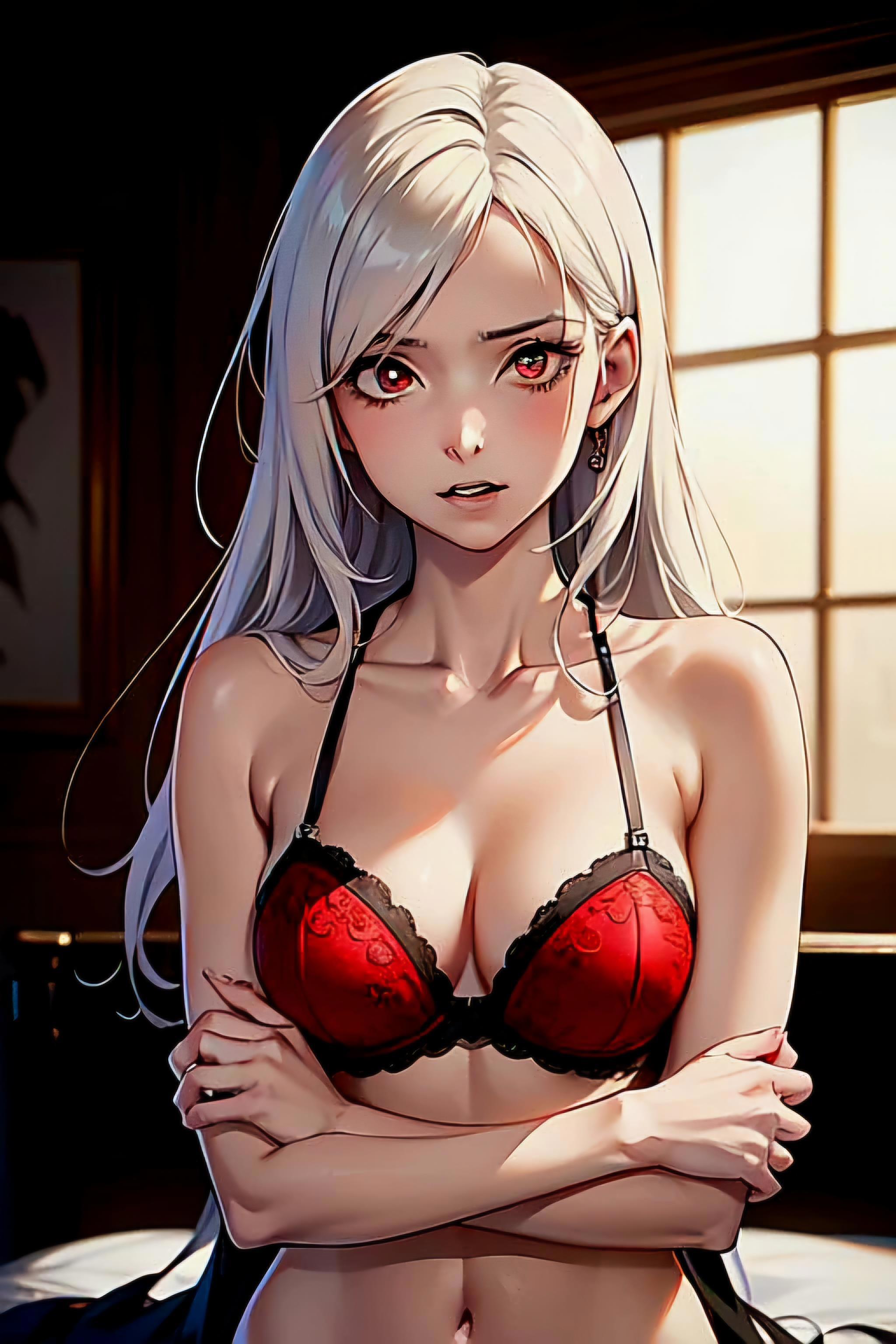 Открыв дверь, я замер на месте. Передо мной стояла Истрит, одетая лишь в откровенное нижнее бельё. Её кожа была бледной, как алебастр, а глаза сверкали холодным алым блеском. Несмотря на свою наготу, она выглядела величественно и уверенно.