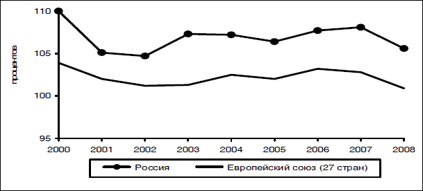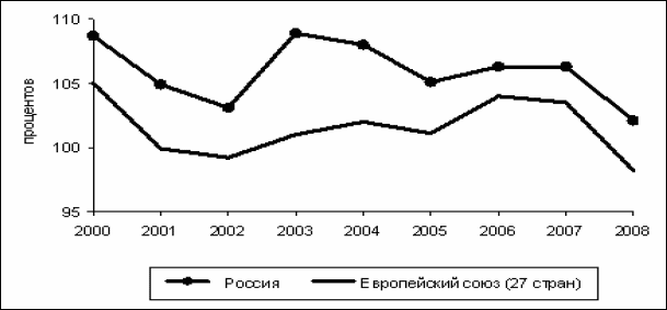 Рис. 2.1. Динамика индекса изменения ВВП России и ЕС (данные Росстата)