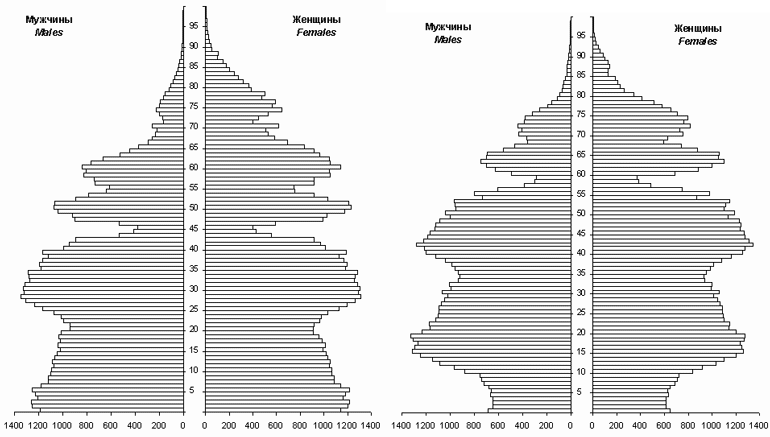 Рис. 3.3. Динамика возрастно-половой структуры населения РФ в 1989 и 2002 гг. (источник: Демографический ежегодник 2009 г.)