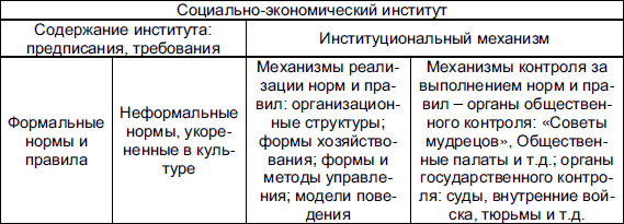 Т.И. Заславская рассматривает четыре элемента структуры институтов: формальные нормы и правила, регламентируемые властными и управленческими органами: правовые, административные и организационные; неформальные нормы, укорененные в культуре общества; механизмы государственного контроля за выполнением установленных норм и правил; механизмы общественного контроля [43] .