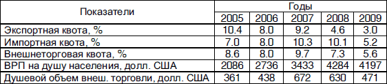 Не менее важны не только первичные, но и производные показатели, характеризующие развитие внешней торговли региона (табл. 2). По проведенному анализу можно сделать вывод, что на момент 2005 г. экспортная квота была намного больше импортной, но с 2006 г. началась заметно снижаться, а импортная – увеличивалась. В 2007 г. экспортная квота выросла, но в 2008 и 2009 гг. наблюдается ее резкое уменьшение. Импортная квота в 2007 и 2008 гг. сохраняется на одном уровне, но к 2009 г. значительно снизилась с 9.7 % до 5.6 %. Внешнеторговая квота достигла пика в 2007 г., а спада в 2008 и 2009 гг.