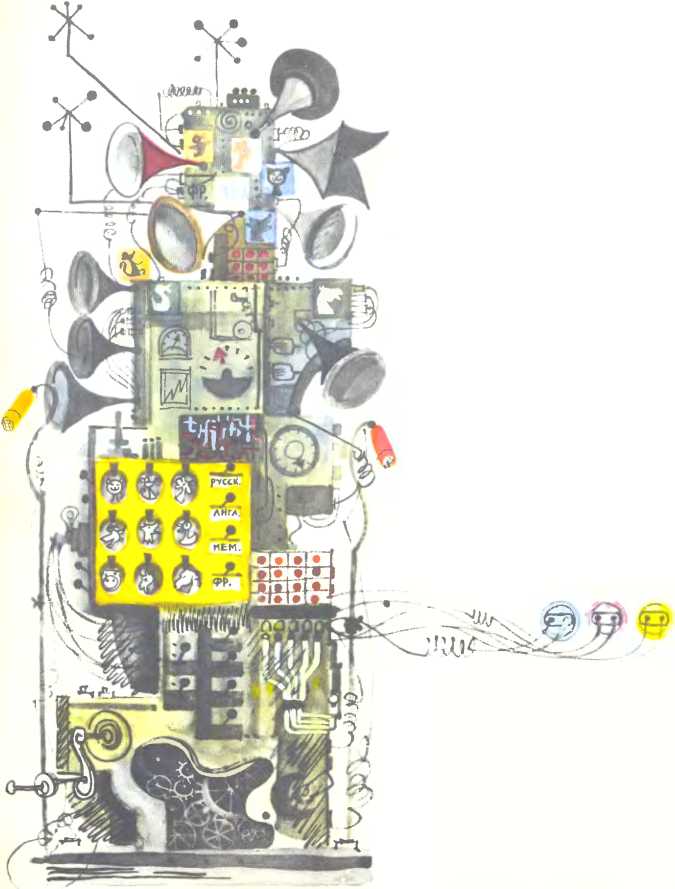 Самое важное в машине — это множество рычагов и громкоговорителей. И микрофоны. Если вы внимательно приглядитесь, то увидите на рычагах и громкоговорителях маленькие картинки, на которых нарисованы разные птицы и животные: петух, канарейка, мышь, кошка. На других нарисованы буквы: фр., нем., лат., англ., русск.
