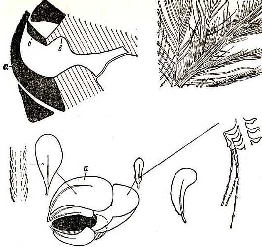 Рис. 4. Наружное ухо птицы, способной к имитации человеческой речи (Ильичев, 1972) а — переднеушная птерилия, образующая свод под ушным отверстием; б — заднеушная птерилия, образующая звукоулавливающую раковину; 8 — кожная складка оперкульм, регулирующая форму и направленность отверстия