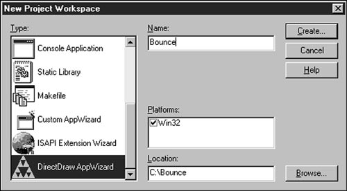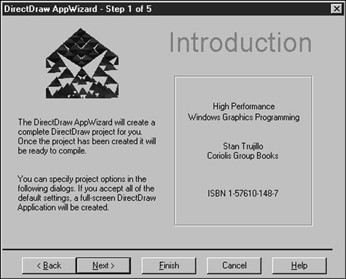 Наш нестандартный DirectDraw AppWizard создает приложения DirectDraw. Для установки DirectDraw AppWizard можно воспользоваться инсталляционной программой с CD-ROM или просто скопировать с диска файл AppWizard (с расширением AWX) в каталог с шаблонами Visual C++.
