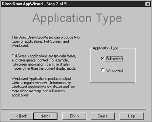Во втором окне DirectDraw AppWizard предлагается выбрать тип создаваемого приложения: полноэкранное или оконное. По умолчанию установлен переключатель Full-screen (для полноэкранного приложения). Наше изучение начнется именно с полноэкранных приложений, поэтому оставьте тип, выбранный по умолчанию. Второе окно AppWizard изображено на рис. 3.3.