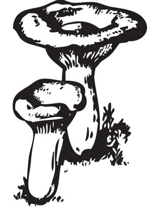 Пластинки нисходящие по ножке, редкие, толстые, белые, желтеющие с возрастом, около ножки с перемычками.