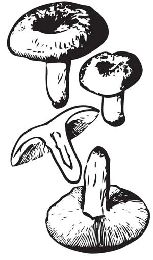 Пластинки нисходящие по ножке, кремовые или бледно-розовые с желтоватым оттенком, тонкие. Ножка цилиндрическая, ровная или суженная книзу, ломкая, полая, гладкая, бледно-розовая.