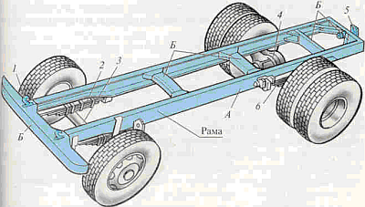 и представляет собой систему балочной конструкции и состоит из двух продольных балок-лонжеронов А, соединенных поперечными балками Б с использованием заклепок или сварки. На раме закреплены все основные агрегаты и узлы. Рама автомобиля воспринимает все нагрузки, возникающие при движении автомобиля.Рис Ходовая часть