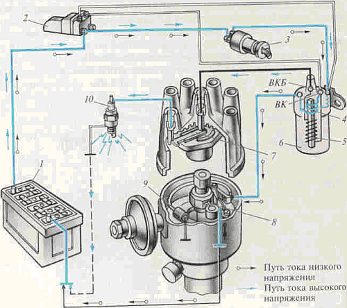 Цепь высокого напряжения : вторичная обмотка 5 катушки зажигания 6 – распределитель 7 – провода высокого напряжения и искровые свечи зажигания 10.
