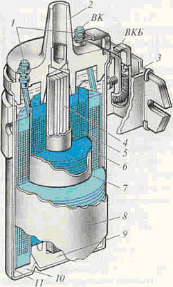 Катушка зажигания, преобразующая ток аккумуляторной батареи (ток низкого напряжения) в ток высокого напряжения, поступающий к свечам (вторичный ток), состоит из стального корпуса 8, сердечника 4, первичной обмотки 6 (из 250 – 400 витков толстого изолированного провода диаметром 0,8 мм, намотанной поверх вторичной обмотки и изолированного от нее слоем специальной бумаги), вторичной обмотки 5 (состоящей из 18 000 – 20 000 витков изолированного провода диаметром 0,07-0,1 мм и намотанного на картонную трубку, установленную на сердечнике), краболитовой крышки 2 с центральными контактами и зажимами ВКБ, ВК и добавочного резистора 3.Чтобы повысит надежность изоляции, обе обмотки пропитаны трансформаторным маслом 10. С этой же целью все свободные полости в корпусе 8 катушки залиты специальной изоляционной массой, у некоторых катушек зажигания заполнены трансформаторным маслом.